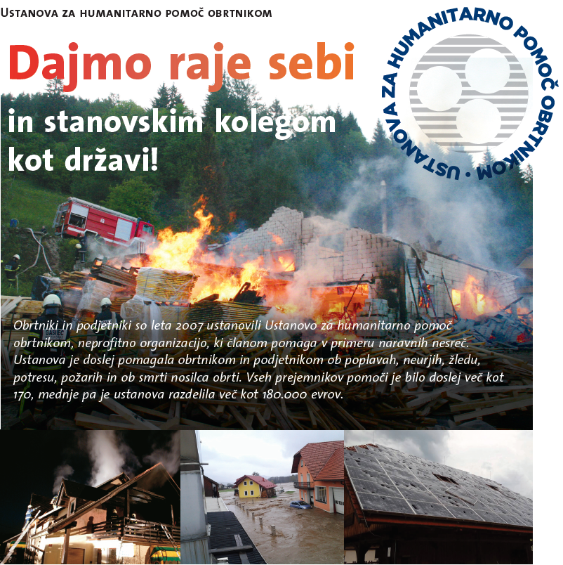 Živimo in delamo na področju, kjer so elementarne nesreče dokaj pogoste, poleg tega pa se tudi mnogo obrtnikov in podjetnikov ukvarja z dejavnostmi, ki so nevarne za zdravje ljudi in okolje, morebitne nesreče pa so lahko zelo obsežne in imajo nepredvidljive posledice. Zato so obrtniki in podjetniki že leta 2007 ustanovili Ustanovo za humanitarno pomoč obrtnikom, neprofitno organizacijo, ki članom OZS pomaga v primeru nesreč. |