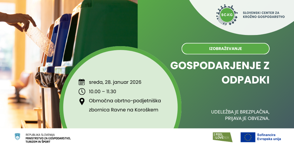 Vabljeni na brezplačno spletno izobraževanje za MSP o ključnih zakonodajnih novostih in obveznostih pri ravnanju z odpadki, ki bo potekalo 6. marca 2025 prek Zooma. Udeleženci boste pridobili vpogled v novo Uredbo o odpadkih, pripravo letnih poročil ter obveznosti glede embalaže in odpadne embalaže. |